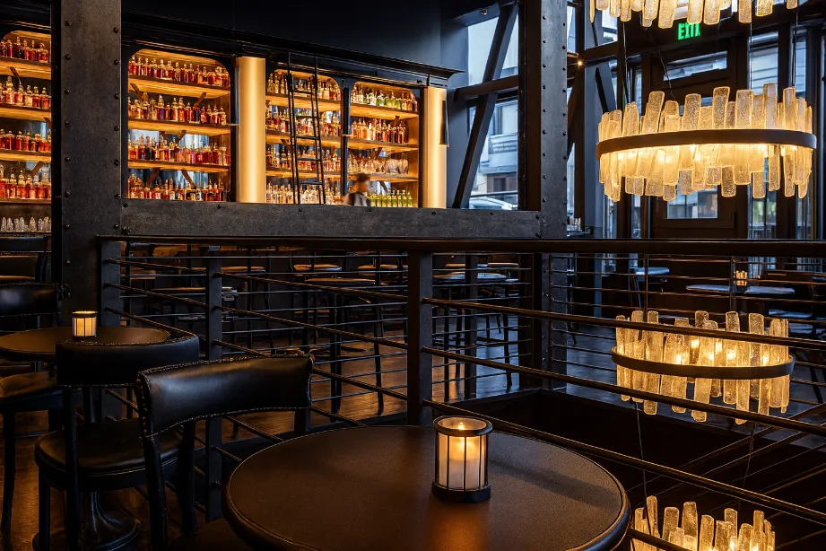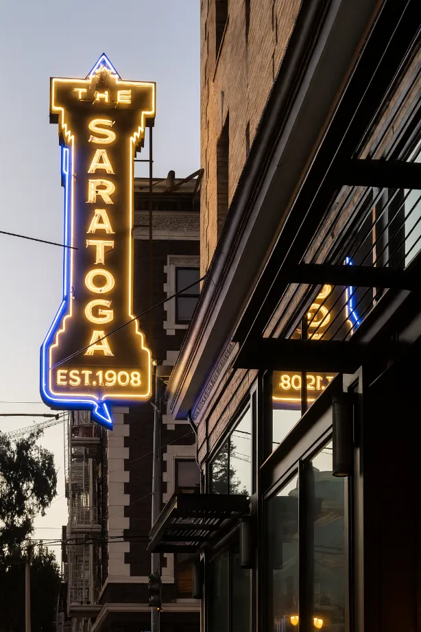 The Saratoga in San Francisco was designed as a modern interpretation of a classic supper club. Rich materials, layered lighting, and bespoke furnishings create a moody yet sophisticated atmosphere that feels both timeless and current. The two-level space balances the energy of a lively bar with the intimacy of elegant dining areas, offering guests a setting that elevates everyday dining into a memorable experience.